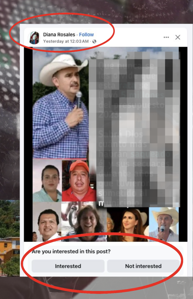 La imagen que ilustra esta denuncia no es un simple post viral de activista independiente: se trata de un anuncio patrocinado que irrumpe sin permiso en los timelines de miles de usuarios sin la menor conexión previa con la página emisora –el infame botón “Interested/Not interested” lo delata como tal–, obra de Diana Rosales a través de su perfil @HidalguensesUnido, donde disemina información falsa e incendiaria sobre José Juan Viggiano.